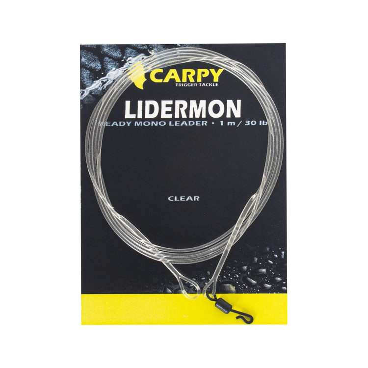 با استفاده از لیدرهای آماده کار شما بسیار آسان تر و ساده تر می شود ، بسیاری از لیدرها را می توانید از قبل آماده کرده و در لوازم خود نگاه دارید تا به محض پاره شدن نخ یا نیاز تعویض بیدر با سرعت تمام اقدام کنید ، اما لیدرهای بسیار کارآمدی هستند که تهیه آنها برای ما مقدور نیست و در صورت تمایل باید بصورت آماده تهیه کنیم. لیدرمون یکی از این موارد استثناست.لیدری بی رنگ و شفاف ، بیسیار نرم ، ضد پیچش و تاب ، قدرت بالای فرو روی و همشکل سازی خود با پستی و بلندی های بستر دریاچه و بالاتر همه قدرت کشسانی قوی که می تواند پرتابهای بلند شما را به نقاط دورتری برساند. در یک سر این لیدر یک هرزگرد کوییک چنج جهت بکارگیری در سیتم لید کلیپ تعبیه شده اما شما می توانید با برش آن و جایگذاری یک بافر بید و یک کوییک لینک یا اسنپ کلیپس لیدرمون را در سیستم هلی کوپتری بکار بگیرید.